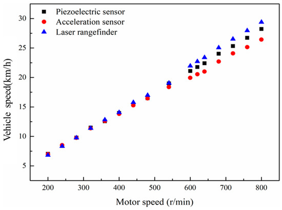 Piezoelectric sensors and acceleration sensors embedded in the road were used to obtain the interval between the voltage peaks generated by the device’s front and rear axles passing. The laser rangefinder was used to obtain the interval time between two passes of the laser rangefinder. These two kinds of time intervals were calculated with wheelbase and test road length, respectively, to obtain the corresponding relationship between motor speed and vehicle speed, which is shown in Figure 4.