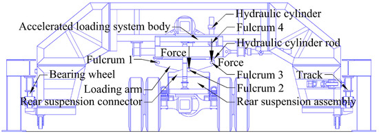 Two hydraulic cylinders are respectively installed on the front and rear sides of the accelerated loading system and are connected to the body of the device through fulcrum 4. The top of the hydraulic cylinder rod is connected to fulcrum 3 with the loading arm, and the loading arms at both ends are connected by H-shaped steel. The loading arm and the rear suspension connector are connected by fulcrum 2, and the rear suspension connector is connected to the rear suspension assembly by bolts. When the hydraulic cylinder is loaded, the force is transmitted from the top of the hydraulic cylinder rod to the loading arm through fulcrum 3. The loading arms have a tendency to rotate around fulcrum 1 in order to maintain the force balance of the loading arms, fulcrum 2 gives the loading arms force, and the reaction force will eventually be transmitted to the rear suspension assembly. At the same time, the force received by the hydraulic cylinder will be transmitted to the body of the accelerated loading system through fulcrum 4, and the body will transmit the force to the track through the four bearing wheels contacting the lower surface of the track.