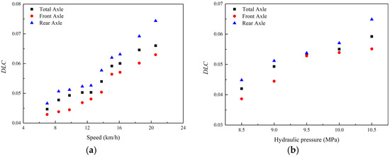 Measurement of dynamic axle load. (a) Relationship between DLC and speed. (b) Relationship between DLC and hydraulic pressure.
