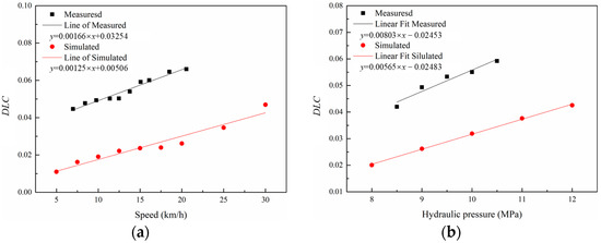 Comparison of DLC between measured and simulated. (a) Different Speeds. (b) Different Hydraulic Pressures.