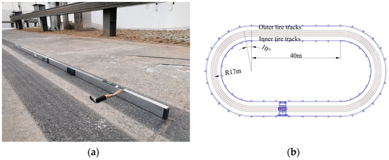 The 3 m ruler and feeler gauge, as shown in Figure 12a, was used to measure the road roughness of the circular test road. Figure 12b is a schematic diagram of the circular test road, the straight road section is 40 m long, and continuous measurement is performed without interruption. The radius of the center line of the curved road section is 17 m, and the curved road section is equally divided by 10 degrees, and the chord length of each section is measured continuously.