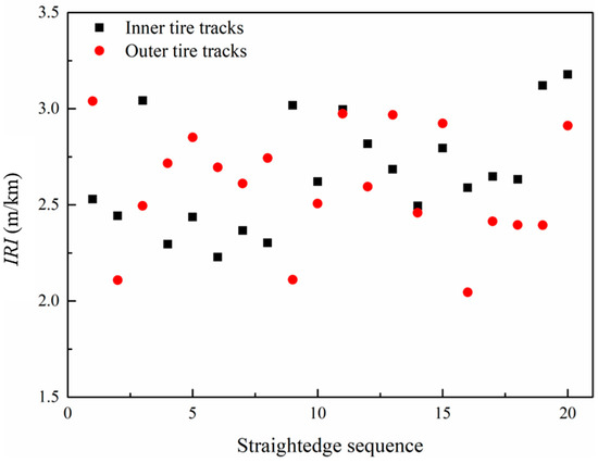The average value of IRI is counted every 10 m for straight road sections, and the average value of IRI is counted every 30 degrees for curved road sections. There are 20 IRI values for the inner and outer wheel tracks, as shown in Figure 13.