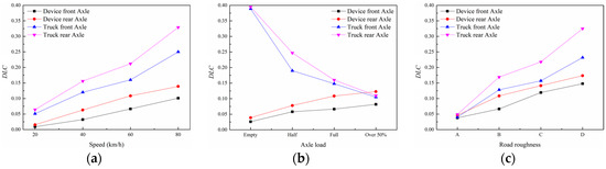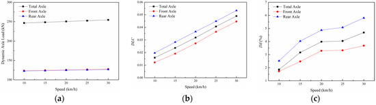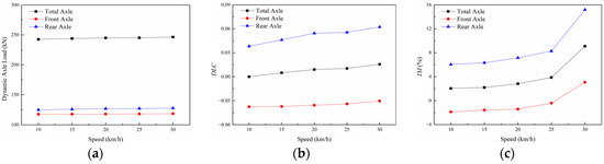 Figure 14 shows the dynamic axle load, DLC, and IM changing with the speed in curved road sections. The dynamic axle load, DLC, and IM of the device all increase with the increase in speed. The total dynamic axle load increased from 242.60 kN to 246.39 kN; DLC increased from 0.001 to 0.016; IM increased from 2.05% to 9.09%. When the vehicle speed reaches 30 km/h, the IM value increases significantly. The main reason is that in curved road sections, the device relies on rigid wheel-track contact to swerve, and the change in wheel-track contact force is proportional to the square of the speed. Therefore, as the speed increases, the wheel-track contact force will increase significantly, causing the device to vibrate and the significant changes in the dynamic axle load.