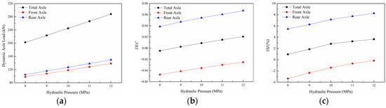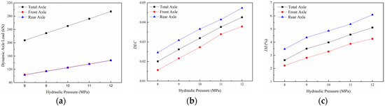 It can be seen from the figure that the dynamic axle load, DLC and IM all increase with the increase of the hydraulic pressure. The total axle load increased from 202.37 kN to 287.87 kN, DLC increased from −0.005 to 0.021, and IM increased from 0.96% to 3.65%. As mentioned above, because the device is affected by the vibration of the device in the curved road section, the force of the hydraulic cylinder in the running state is not as high as that under static conditions, so the dynamic axle load of the device under the condition of 8 MPa is slightly less than the static axle load.