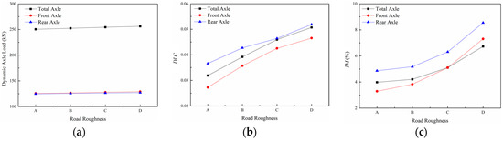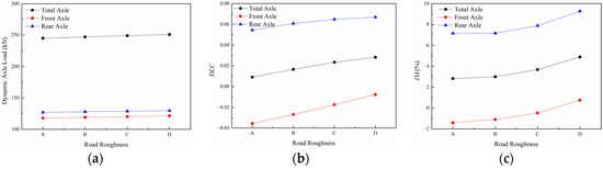 Dynamic axle load in straight road sections with different road roughness under simulation conditions. (a) Dynamic axle load. (b) DLC. (c) IM.