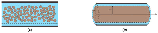 As schemed in Figure 2a, we assume that the dispersed oil droplets are uniformly distributed near the axis of the tube, surrounded by a clear annulus of continuous water. The assumption is made since the reservoir is usually hydrophilic due to the impacts of surfactants during chemical flooding. Then, we consider the effective resistance of the dispersed oil droplets flowing down the center of the tube. As illustrated in Figure 2b, the suspension in the center of the tube is approximated to an axial cylindrical flow with an effective radius , and the width of the surrounding annulus of continuous water is .