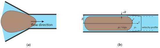 - Hodges, S.R.; Jensen, O.E.; Rallison, J.M. The motion of a viscous drop through a cylindrical tube. J. Fluid Mech. 2004, 501, 279–301. [Google Scholar] [CrossRef]
