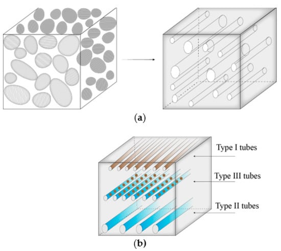 Schematic view of the porous medium and the proposed capillary bundle model. (a) Porous medium and capillary bundle model; (b) the way the capillary tubes divided into three types.