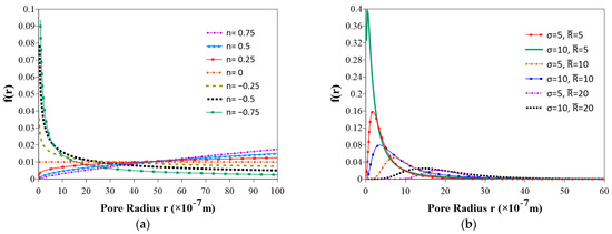For the power-law PSD function, it is obvious from the figure that when n lies between 0 and -1, smaller pores constitute most of the overall pore population, with this tendency diminishing as n increases. When equals 0, the distribution of pore sizes is uniform. Conversely, when is greater than 0, larger pores gain prominence, and this trend amplifies as continues to increase. For the log-normal PSD function, it could be noticed that even with the same average pore radius, different variances have a significant impact on the peak position of the pore size distribution. A smaller would result in a smoother function curve, also making the peak position closer to the average pore radius.