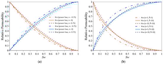 Based on Equations (35) and (36), the oil–water relative permeability curve could then be presented as Figure 6a, with the given PSD functions. Figure 6b shows the relative permeability of the continuous oil phase and continuous water phase, when there are no emulsions participating. By analyzing the curves depicted in Figure 6, it can be observed that as the proportion of smaller-sized pores increases, the relative permeability of the water phase increases at equivalent saturation levels. Additionally, a more concentrated distribution of pore sizes results in an enhanced curvature of the relative permeability curve for the water phase. It should be noted that the wettability of different phases was not considered in the proposed model, thus the value of always equals 1.