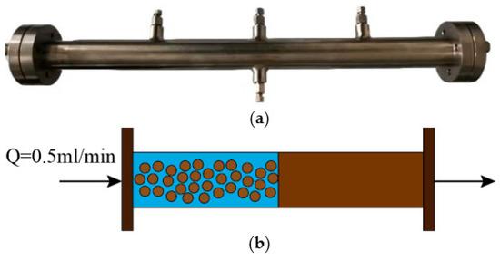 To validate the proposed model, a one-dimensional sandpack displacement experiment has been carried out. As shown in Figure 7, the sandpack holder was packed by 100-150 mesh quartz sands, and was initially saturated with crude oil. The sandpack was then injected continuously by a prepared O/W emulsion, at a constant flow rate of 0.5 mL/min. The O/W emulsions were prepared from heavy crude oil with a viscosity of 206 mPa·s at 60 °C (same sample as the saturated oil). The surfactant used to form emulsions in this experiment is SDS with a concentration of 0.5 wt%. The dispersed oil volume fraction of the prepared O/W emulsions was 20%. The length and the diameter of the sandpack holder were 80 cm and 2.5 cm, respectively. The porosity and water permeability of the sandpack were tested before the experiment, and the values of which were 0.38 and 1890 mD, respectively. The residual oil saturation and the irreducible water saturation were also measured, with values of 0.435 and 0.125, respectively.