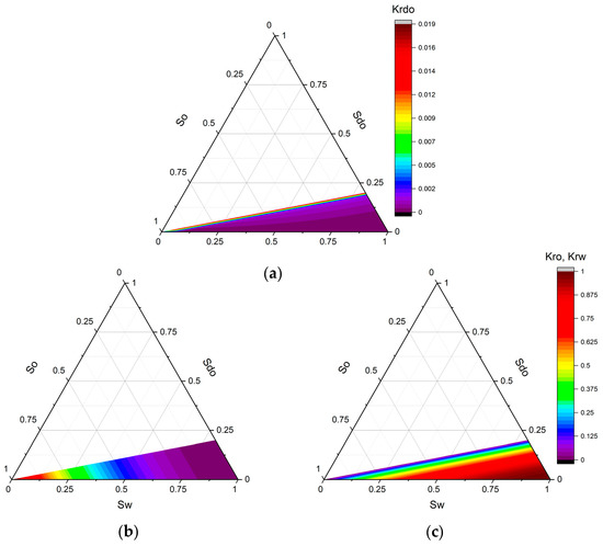 Three-phase permeability ternary diagram for simulation. (a) Permeability of dispersed oil phase; (b) permeability of continuous oil phase; (c) permeability of continuous water phase. The permeability of the continuous oil phase and continuous water phase shares the same color bar.