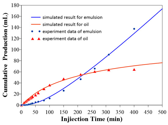 Due to experimental limitations, it is unable to quantify the volume of the dispersed oil phase in the produced emulsions. Therefore, the volumes of the continuous water phase and dispersed oil phase from the simulation results were added to compare with the cumulative production of the emulsions measured in the experiments. Since the sandpack is initially oil-saturated in this experiment, all the continuous water phase comes from the injected emulsion. Additionally, it has been experimentally verified that the dispersed oil phase in the prepared emulsion can be considered stable. Thus, the comparison between the simulation results and the experimental data is reliable. The simulation results are shown in Figure 9, compared with the experimental data. As illustrated in the figure, the simulation results and experimental data showed a considerable agreement, with the maximum error not surpassing 10%. The results validated the reliability of the proposed relative permeability model.