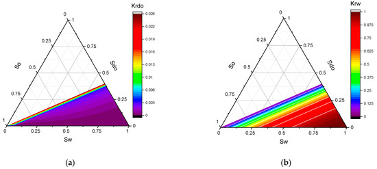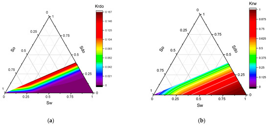 The relative permeability ternary diagrams of dispersed oil and continuous water phase when , , and . (a) Dispersed oil; (b) continuous water.