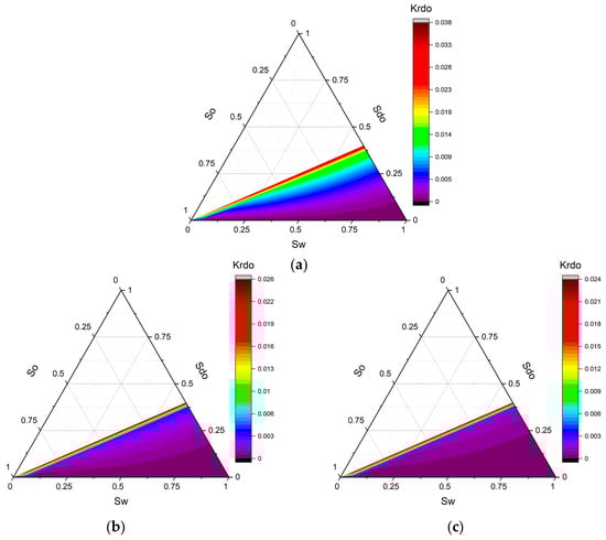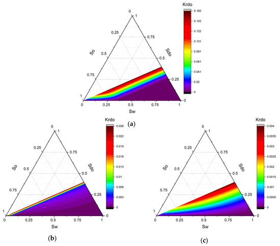 The relative permeability ternary diagrams of the dispersed oil phase with , and different . (a) ; (b); and (c) .