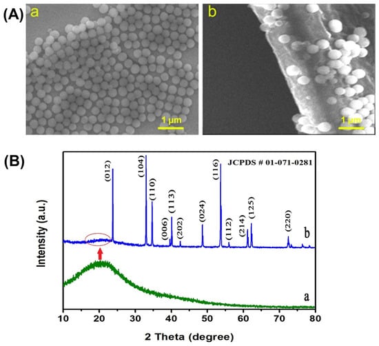 The as-synthesized mAPFR MMSs were examined by scanning electron microscopy (SEM). Figure 1A shows that the SEM images of the as synthesized MMSs (a) and Ti2O3/mAPF MMSs (b) contained a number of MMSs. The magnified SEM image of these MMSs demonstrates that the mAPFR MMSs were in the diameter of ca. ~400–450 nm. Additionally, Figure 1A(a) reveals that the MMSs had an even spherical shape and that particles did not accumulate. The SEM image of Ti2O3 decorated on the mAPFR MMSs is shown in Figure 1A(b).