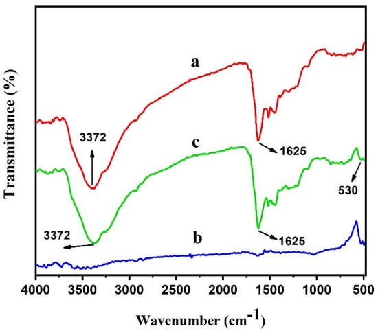 Figure 2 shows the FTIR spectrum of the pristine mAPF and Ti2O3 compared to the Ti2O3/mAPF MMSs. As seen from Figure 2a, the peak at 1289 cm−1 formed from the aromatic-oxygen–carbon stretching; at the same time, the broad band at 1379 cm−1 can be associated with the carbon–nitrogen from the NH2 group [83]. The arrival of a low and broad peak at 3372 cm−1 and a strong and narrow peak at 1613 cm−1 were accredited to the occurrence of the –OH and NH2 groups, respectively. The appearance of a peak around 1500 cm−1 was attributed to the carbon–hydrogen stretching, considering that the absorption band around 2900 cm−1 was because of the methylene asymmetric stretching vibration. For the Ti2O3 magnetic nanoparticles (Figure 2b), the peak that appeared at 526 cm−1 was responsible for the titanium–oxygen bonds. The symmetric (1578 cm−1) and asymmetric vibrations (1634 cm−1) of the carboxylate groups derived from ligands on the surface Ti2O3. Figure 2c reveals the spectra of the Ti2O3/mAPF MMS composites. The carboxylate groups appeared at 1500 cm−1, and the respective apex of the titanium–oxygen bond that appeared around 476, 534 cm−1 in the FTIR of Ti2O3/mAPF was adopted from Ti2O3. The rest of the bands originated from mAPF along with the stretching vibrations at 3252 cm−1 (oxygen–hydrogen or –OH…nitrogen), 3366 cm−1 (N-H or NH…O), Ar–H vibration (1212 cm−1), and the respective aromatic rings bands around 1517 cm−1 [84,85,86,87,88].