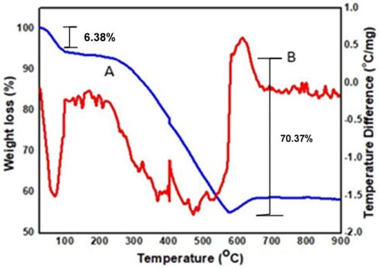 TGA curve of Ti2O3/mAPF (blue line—A) and the DTA curve of Ti2O3/mAPF (red line—B).