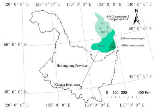 In the same unit, afforestation plots that were basically the same were taken as the same category to be stratified. Based on this survey principle, the baseline plots were divided into three layers, as shown in Table 1. Vegetation coverage of each layer at the baseline was as follows: shrubs and herbs at the BSL-1 layer; zero vegetation coverage at the BSL-2 layer; Picea koraiensis and herbs at the BSL-3 layer, in which the DBH of each Picea koraiensis was determined, and the planting area and the forest stand age were investigated. Three evenly distributed 5 m × 5 m shrub samples in the shrub-covered area were selected and were set in an equilateral triangular shape to directly determine the shrub biomass with the harvest method. The investigation method for the herb-covered area was the same as that for the shrub-covered area. A baseline stratification plane graph was completed according to boundary data and topographic map data (Figure 1).