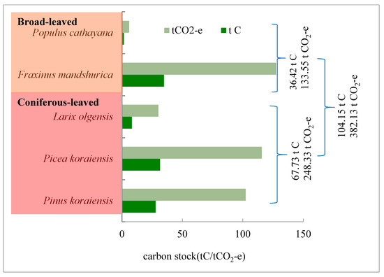 The carbon sink of 5 native tree species was calculated according to relevant models and parameters of estimating live biomass with the default method from the IPCC’s Technical Guidelines for National Forestry Carbon Sink Accounting and Monitoring (Table 3) [32,33]. The baseline carbon accounting included the original baseline tree species of Picea koraiensis, shrubs and grass, and the CSA’s carbon accounting included arbor species. The biomass of each tree species in different years in the calculation period was obtained from the planting area, the annual increment per unit area, and the ratio of the root to stem of each tree species. The carbon stock of each tree species was calculated with the combination of the carbon content, and the dynamics of the forest stand in the calculation period were estimated by addition and statistics with Formulas (1) and (2). The biomass density and the carbon content of shrubs and grass were obtained with the direct harvest method, laboratory measurements, and analysis. The biomass and the carbon stock of shrubs and grass were calculated based on the coverage area of baseline shrubs and grass. According to the annual change rate of the coverage area of baseline shrubs and grass (referring to the Class II survey data of the Longjiang Forest Industry for 2013–2016), the biomass and carbon stock dynamics of shrubs and grass in the calculation period were estimated as Formula (3). The carbon emission and leakage were estimated by the bottom-up approach described by GPG2000 as Formulas (4)–(7). The net carbon sink in the calculation period was the difference between the change of the afforestation’s carbon stock and the sum of the change in the baseline carbon stock, in the carbon emission within the project boundary, and in carbon leakage outside the boundary as Formula (8). EXECL2003 was used for calculation, analysis, and tabulation; ORIGINF2018 was used for statistics and mapping.