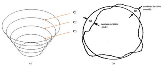 Throughout the depth of the cone, circularity errors were estimated at three different levels. The CMM was used to measure the coordinates of 30 points along a circular path in the XY-plane while maintaining a constant probe height in the z-direction. The process was repeated at locations C1, C2, and C3, as shown in Figure 2a. A typical circularity error test exhibited a circular deviation, as shown in Figure 2b. For each level of measurement (C1, C2, and C3), a circle was fitted using the least squares method and the maximum radial deviations (inside and outside the fitted circle) were recorded (B1 and B2). Based on ISO 230 4:2005(E) [23], the circular deviation was calculated as the maximum radial separation between two concentric circles enclosing the actual path. The circularity error was calculated as the sum of the two deviations, B1 and B2.