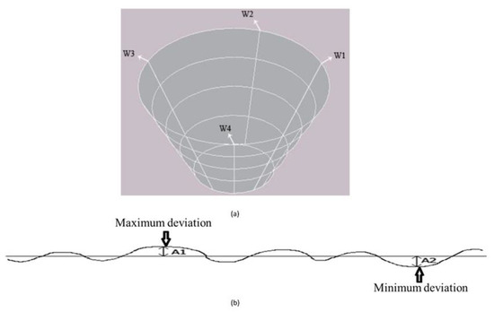 The waviness error was determined by selecting approximately 200 points along 4 paths (W1, W2, W3, and W4), as shown in Figure 3a. The recorded points were used to fit a line using the least squares method. This process was repeated along each of the four paths that were 90° apart. Figure 3b shows the maximum deviations from the line (A1 and A2). According to ASME B46.1-1985 [24], the waviness deviation is calculated as the sum of A1 and A2. Using two values, the waviness error is expressed as the average and maximum of each part’s four deviations.
