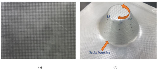 A grid of squares with a side length of 2 mm was electrochemically etched onto the surface of the workpiece before forming in order to measure the strains and calculate the stresses and thinning of the final part, as shown in Figure 4. In order to determine the strains and calculate the stresses and thinning, a grid analyzer, model 100 (FMTI Systems, Ontario, Canada) was utilized. Strain was measured at various points along the wall to capture the variation in the wall. The measurements were taken along lines L1, L2, and L3, with five grids being selected on each line, as shown in Figure 4b. Principal stresses were calculated from the experimental values of principal strains by the GRID ANALYZER using the following equation: