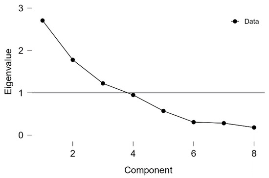 In Figure 5, the scree plot illustrates the eigenvalues of the eight components after cluster rotation.Table 6 presents the eigenvectors, eigenvalues, and explained variation (contribution) for the first three components, where PC1, PC2, and PC3 represent the first three principal components after cluster rotation. There were only three components with eigenvalues greater than one, and thus they satisfied Kaiser’s criterion. Furthermore, their cumulative contribution exceeded 0.714, which exceeded the cut-off limit of 0.7. As a result, only the first three components were considered in the rest of the analysis.