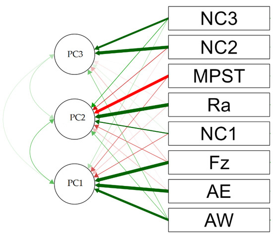 Figure 6 shows the path plot that related the original response variables to the three selected components PC1, PC2, and PC3. The principal components are shown on the left as circles. Variables are represented on the right by rectangles. A variable’s loading on the principal components is represented by arrows pointing to the component. Red arrows indicate negative loadings and green arrows indicate positive loadings; the wider the arrow, the greater the loading.