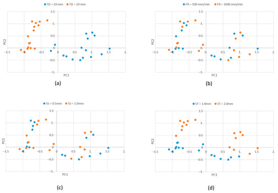 The score plots in Figure 7 show the results of the first two components, colored according to tool diameter (a), feed rate (b), step size (c), and sheet thickness (d). There is a clear distinction between the scores in Figure 7a,d as the scores divided into two regions whereas the scores in Figure 7b,c do not have this distinction. This was due to the fact that the tool diameter and sheet thickness had the greatest effect on the final product characteristics in this study.