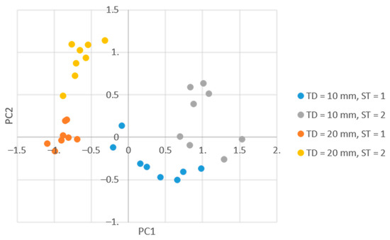 In Figure 8, scores are presented in relation to both the tool diameter and sheet thickness at the same time. In the graph, there are four distinct regions that show a significant interaction between the tool diameter and sheet thickness. Research has previously demonstrated this interaction. As shown in the figure, sheet thickness separated the data around PC1 while the tool diameter separated the data around PC2. The sheet thickness had the greatest effect on the forming force [19] and, therefore, on the quality of the side walls, which was represented by PC1. In terms of surface roughness and principal strain, the tool diameter had the greatest impact [20,21].