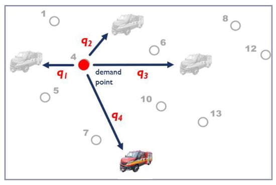 Without any loss of generality, it is assumed that the r closest-located fire stations may participate in covering the current demand for service occurring anywhere. In the adjusted quality criterion, qk stands for the likelihood that the k-th nearest FPU is the one that is closest, currently available, and may be able to meet increased service demand. This idea greatly increases the realism of the deterministic model because it considers the stochastic behavior of the real system at a certain level. The basic idea can be easily understood by looking at Figure 1, which was originally created for a medical rescue system.
