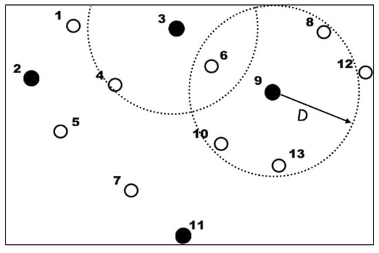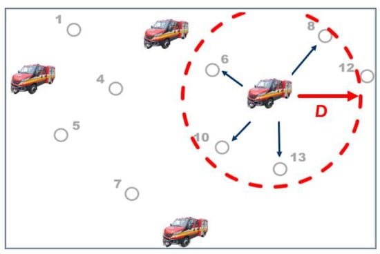 A collection of binary variables zj must be provided in order to represent the aforementioned fairness criterion using mathematical expressions. The variable zj∈{0, 1} is defined for each location of the clients jJ. It takes a value of zero if the client’s location j is covered by service within the radius D from the nearest fire station. As can be seen in Figure 2, the auxiliary variable z12 takes a value of one, and the variables z6, z8, z10, and z13 take a value of zero. The mathematical expression can take the form of (32).
