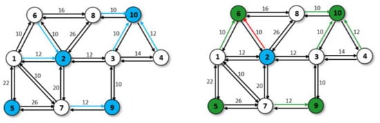 If one looks at the model (1)–(6), the most important starting point for the new model consists of the constraints (2). Note that for each jJ, there is only exactly one variable zij taking the value of one. This means that each supplied network node is associated with only one established fire station. From the standpoint of evaluating the objective function (1), it is not crucial to know which FPU is closest to network node j because the distance, not the FPU, is what matters the most. If we know the list of located FPUs, we can easily identify the nearest one for any served node. Thus, the territorial jurisdiction may be computed secondarily, and it is not necessary to model it with allocation variables. The so-called radial formulation, which was first published in [27,28,29] and revised in [30,31], provides the remedy for the aforementioned shortcoming of the location-allocation model (1)–(6).