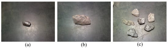 This study used coal and gangue as the research objects, and the collection site was a mining area in Huainan City, Anhui Province. The FLIR E50, a thermal imaging camera, was applied as the image acquisition device. Images of coal and gangue were acquired under the same lighting and background conditions at a distance of 30–40 cm. The particle size range of coal and gangue is 10–150 mm. A total of 600 visible photos of coal and gangue were collected, and the resolution of each photo is 2048 pixel × 1536 pixel. in order to improve the detection accuracy, not only the image data containing single coal or gangue need to be collected but also the image data of the mixture of coal and gangue with different sizes. Experimentally obtained images of partial coal and gangue are shown in Figure 1.