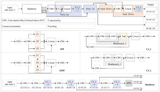 Yolov5s network is one of the most widely used detection networks in industrial applications such as production processes [24], autonomous driving [25], monitoring and safety [26], and it achieves high detection accuracy in target detection as well as good results in inference speed. The detection principle of the Yolov5s network is shown in Figure 2, and the structure includes the input, backbone network, neck network, and output. Among them, the input is the input image size and normalization method. The backbone network extracts the processed image to get the multi-scale feature map. The main ones in the backbone network consist of the CBS module, the C3 (Concentrated comprehensive convolution) module, and the SPPF (Spatial Pyramid Pooling-Fast) module [27], which are responsible for feature extraction and feature segmentation of the processed image to obtain the depth features and different scales of the image. In addition, C3 modules can be divided into C3_1 and C3_2 depending on the bottleneck structure [28]. The neck network mainly consists of a feature pyramid network (FPN) [29] and a path aggregation network (PAN) [30], which achieves a multi-scale fusion of the features extracted by the backbone network after multiple upsampling and downsampling for use at the output. The output side outputs the detection results, including information on each test frame’s position, category, and confidence level.