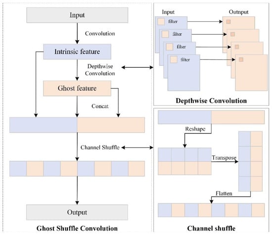 DWC module is essentially group convolution, a particular case when the number of groups equals the number of input feature map channels. It reduces the model’s training parameters and increases the diagonal correlation between adjacent layer filters, making the training less prone to overfitting. The GSC module generates more features using fewer parameters based on ordinary convolution, thus reducing the computational cost of ordinary convolution layers. In addition, channel shuffle in GSC helps the information interaction between intrinsic feature maps and ghost feature maps, thus encoding more information and improving the stability of the model.