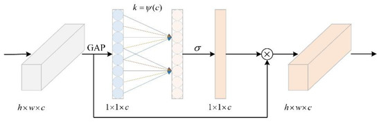 Where and represent the width and height of the input feature map, respectively. represents the global average pooling. represents the coverage of cross-channel interactions. represents the sigmoid activation function. represents the element-wise product.