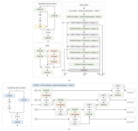 Coal and gangue detection model based on improved Yolov5s. (a) Structure of lightweight backbone network; (b) Structure of lightweight neck network.