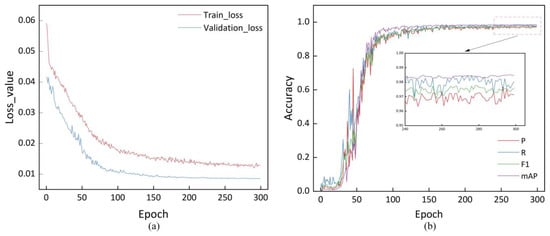 According to the data set type, the prediction model’s loss function can be divided into training loss and validation loss. The curves are shown in Figure 7a. The figure shows that during the model training, the training loss and validation loss decrease rapidly when the number of iterations is between 0 and 50. When the number of iterations reaches 200 or more, the loss value of the prediction model starts to stabilize gradually. From the curves of precision, recall, F1-Score, and mAP in Figure 7b, it can be seen that the trained prediction model does not show any overfitting phenomenon. In addition, each accuracy index of the model ends up at 0.96 or above.