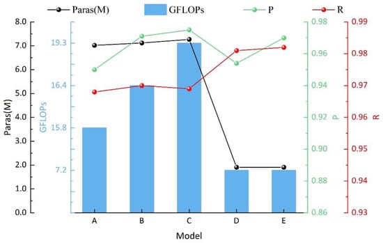 In addition, the performance of the above five models in terms of precision, recall, the number of parameters and FLOPs of the model are shown in Figure 10. The improved Yolov5s have improved the precision and recall of the model while significantly reducing the complexity of the model compared to the original network.