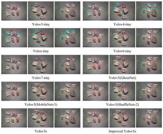 In addition, some detection results of coal and gangue mixtures are selected to visualize the difference in the detection performance of the above algorithms. The results are shown in Figure 11. In addition to the inspection boxes set in the algorithm, the green elliptical boxes represent the cases of missed and false detection by the models. The figure shows that Yolov5s, Yolo series lightweight models and variants of the Yolov5 network have different degrees of false detection and missed detection for different sizes of coal and gangue. However, the model proposed in this paper is free of false and missed detections under the same detection conditions. In addition, compared with the original Yolov5s network, the prediction values of this model for small-scale coal and gangue are mostly higher than those of the original network model. Thus, it is proved that the proposed model is adequate for coal and gangue target detection.