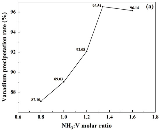 Effects of (a) the NH3:V molar ratio, (b) precipitation temperature, and (c) precipitation time on the vanadium precipitation rate.