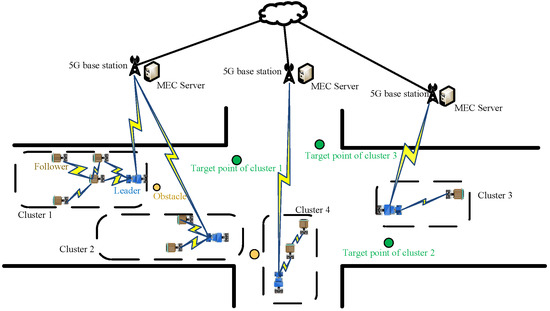 Since the leader needs to collect the location information of obstacles and transmit this information to the MEC of the edge layer for calculation to generate control instructions and then send them to AGVs, the uplink rate of data transmission of the leader needs to be considered. We use Shannon’s formula [13] to calculate the channel capacity between the leader of the cluster and the base station: , where represents the the bandwidth of the base station, represents the transmitted power of the leader of the cluster, represents the antenna gain of the leader of the cluster, and represents the distance from the leader of the cluster to the base station. By calculating the transmission rate between the leader and the base station, we can determine which base station to connect with through 5G. In this paper, we choose to connect to the base stations with higher average transmission rates over a short period of time. In the network-based control scenario, the transmission between agents occurs only at each sampling time, that is, only at time , and then the topology remains unchanged until the next sampling starts.