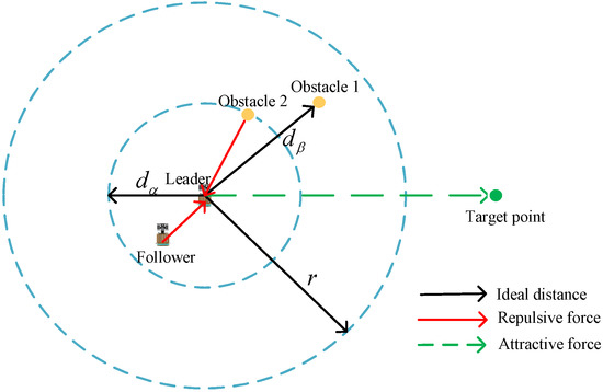 where denotes the attractive force field constant. The negative gradient of the above function is obtained, and the expression of the attractive force of the target point to the leader is: