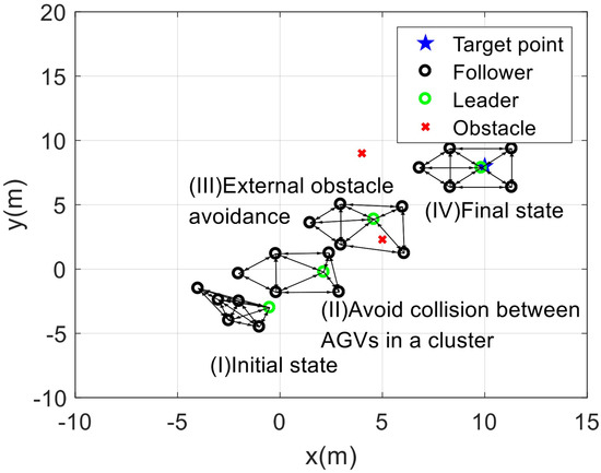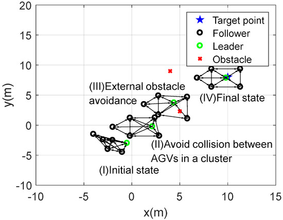 Figure 4 shows four stages of a single cluster in completing a task. The black circle represents the following AGV, the green circle represents the leader, the blue pentagram represents the target point of each cluster, and the Red Cross represents the obstacle. For ease of observation, we sample every and record the position of the AGVs. The sampling point is denoted as k. In this paper, and are respectively selected and presented in Figure 4 as examples of the four situations. As can be seen from the figure, in the initial case, AGVs are closely connected. According to the ideal minimum distance between AGVs set in Table 1, firstly, AGVs in the cluster need to keep a certain distance from each other to prevent collision during driving. The position state of AGVs after internal adjustment is shown in Figure 4 (II). Later, some AGVs encounter obstacles and conduct external obstacle avoidance, which will lead to changes in the distance between AGVs and the connection topology. When the leader continues to move after the external obstacle avoidance is completed and reaches the target point, the topology is shown in Figure 4 (IV), which conforms to the preset desired formation.