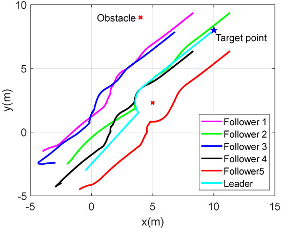 As can be seen from the above process, the whole system remains stable in the case of external environmental interference in the movement process. We can see the effectiveness of the artificial potential field algorithm for obstacle avoidance in the whole system through the position trajectory of the whole process. As shown in Figure 5, each AGV in the cluster is close to each other at the initial time, so internal obstacle avoidance is carried out to avoid possible collisions. When follower 2, follower 5 and the leader are close to the external obstacles, they have an obvious curve of obstacle avoidance and carry out external obstacle avoidance. These two points show that the algorithm adopted in this paper is effective.