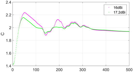 Aggregation coefficient of AGVs with antenna gain of 16 dBi and 17.2 dBi. Different antennas are used to represent different channel conditions. The figure shows the aggregation coefficients at each sampling point under different channel conditions.