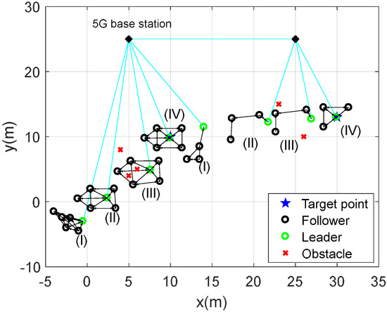 Using the formula proposed by Section 3.1 to calculate the channel capacity. The base station set at has a bandwidth of 10.2 MHz, and the bandwidth of the base station located at is 10 MHz. The noise power spectral density is dbm, and the antenna gain of AGVs and the transmit power of the AGVs are the same as those in Section 6. Each leader selects the channel with a larger channel capacity for data transmission. At the initial point, , . It can be seen that both clusters are connected with the base station 1, as shown in (I) in Figure 8. It can be seen from the figure that with the constant movement of the AGVs, the connection between the leader and the base station will change. In the figure, (I), (II), (III) and (IV) respectively represent the initial state of the cluster, the control of intra-cluster collision avoidance by the AGVs, external obstacle avoidance and the final state.