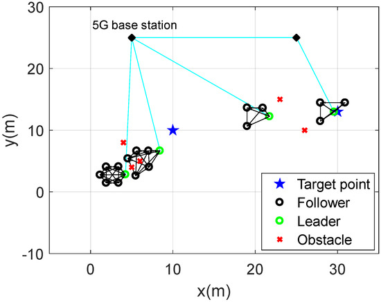 To observe the movement of the two clusters, we selected a two-dimensional space with a simulation environment of to verify the stability of the formation system composed of AGVs of the two clusters and the feasibility of formation transformation according to the channel environment. The channel environment is the same as that in the single cluster case in the previous section, and only the changed parameters are listed here. The left base station is labeled as base station 1, the right base station is labeled as base station 2. The left cluster is labeled as cluster 1, and the right cluster is labeled as cluster 2. The position information of obstacles changes as . The target point of cluster 1 is changed to . The target point of cluster 2 is set as . The initial position of cluster 1 is the same as that in the previous section. The initial position of cluster 2 is , and the ideal position of each AGV in cluster 2 relative to the leader is . Figure 8 shows the motion of the two clusters. The black diamond represents the base station of the edge layer. Consider the two base stations located at and . In order to make the simulation diagram clear, the two base stations are respectively placed at and when the simulation diagram is generated, and they are still set at and in the simulation code.